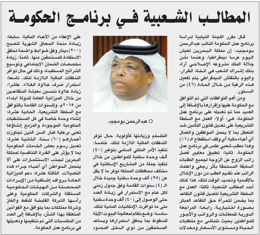 قال مقرر اللجنة النيابية لدراسة برنامج عمل الحكومة النائب عبدالرحمن بومجيد: إن مملكة البحرين تعيش اليوم عرسا ديمقراطيا، وعندما دشن جلالة الملك مشروعه الإصلاحي أراد بذلك إشراك الشعب في اتخاذ القرار، واليوم بالنقاش الديمقراطي يتم تفعيل هذه الرغبة من خلال المادة (46) من الدستور.
