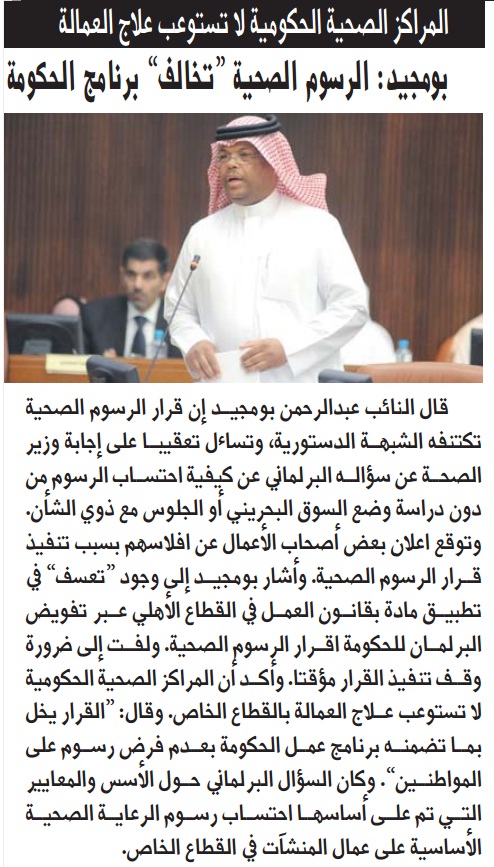 وقال بومجيد : “القرار يخل بما تضمنه برنامج عمل الحكومة بعدم فرض رسوم على المواطنين”. وكان السؤال البرلماني حول الأسس والمعايير التي تم على أساسها احتساب رسوم الرعاية الصحية الأساسية على عمال المنشآت في القطاع الخاص.