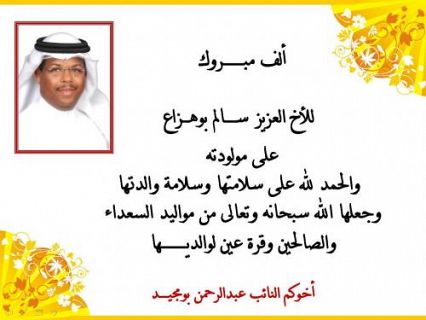 ألف مبروك للأخ العزيز سالــم بوهزاع على مولودته والحمد لله على سلامتها وسلامة والدتها