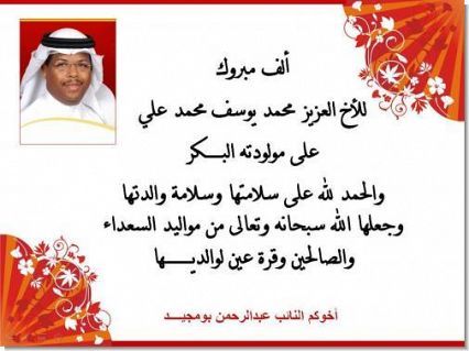 ألف مبروك للأخ العزيز محمد يوسف محمد علي على مولودته والحمد لله على سلامتها وسلامة والدتها