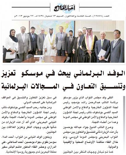 التقى وفد مجلس النواب الذي يزور موسكو برئاسة النائب عبدالرحمن راشد بومجيد رئيس لجنة الشؤون الخارجية والدفاع والامن الوطني السيد ألكسي بوشكوف نائب رئيس لجنة الشؤون الخارجية والدفاع والأمن الوطني في مجلس الدوما وعددا من أعضاء اللجنة.وصرح النائب الشيخ جواد عبدالله بوحسين بأن هذه الزيارة تأتي للتنسيق والتعاون بين مجلس النواب البحريني ومجلس الدوما الروسي¡ وتم خلال اللقاء مناقشة الأوضاع المحلية والإقليمية والدولية.كما تم تبادل وجهات النظر بين الجانبين في سبل تعزيز التعاون والتنسيق في المواقف البرلمانية على الصعيد الدولي.ومن جانبه¡ رحب السيد ألكسي بوشكوف نائب رئيس لجنة الشؤون الخارجية والدفاع والأمن الوطني في مجلس الدوما وأعضاء اللجنة بالوفد النيابي البحريني¡ الذي أكد أن هذه الزيارات من شأنها تقريب وجهات النظر وتعزيز العلاقات بين الجانبين.ويتكون الوفد النيابي من النواب: أحمد الملا¡ سوسن تقوي¡ جواد بوحسين¡ أحمد الساعاتي¡ علي الدرازي¡ وحضر اللقاء الدكتور هاشم الباش سفير مملكة البحرين لدى جمهورية روسيا الاتحادية.