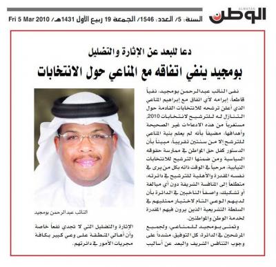 نفى النائب عبدالرحمن بومجيد نفياً قاطعا إبرامه لأي اتفاق مع إبراهيم المناعي الذي أعلن ترشحه للانتخابات القادمة حول التنازل له للترشيح لانتخابات 2010 مستغرباً من هذه الادعاءات غير الصحيحة وأهدافها مضيفاً بأنه لم يعلم بنية المناعي للترشح إلا من سنتين تقريباًمبيناً بأن الدستور كفل حق المواطن في ممارسة حقوقه السياسية ومن ضمنها الترشيح للانتخابات النيابية¡ مرحباً في الوقت ذاته بكل من يرى في نفسه المقدرة والأهلية للترشيح في دائرته¡ متطلعاً إلى المنافسة الشريفة دون أي مبالغة أو تشكيك¡ واصفاً الناخبين في الدائرة بأن لديهم الوعي التام لاختيار ممثليهم في السلطة التشريعية الذين يرون فيهم المقدرة لخدمة الوطن والمواطنين.وتمنى بومجيد للمناعي ولجميع المرشحين في الدائرة كل التوفيق مشدداً على وجوب التنافس الشريف والبعد عن أساليب الإثارة والتضليل التي لا تجدي نفعاً خاصة وأن أهالي المنطقة على وعي كبير بكافة مجريات الأمور في دائرتهم لقراءة الموضوع على موقع جريدة الوطن
