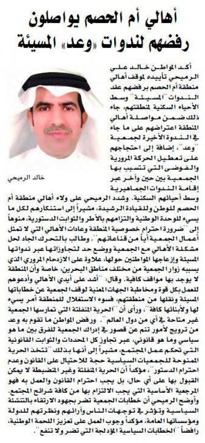 أهالي أم الحصم يواصلون رفضهم لعقد ندوات ((وعد)) المسيئة وسط الأحياء السكنية ويؤكدون ولائهم للوطن والقيادة الرشيدة