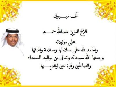 ألف مبـــــــروك للأخ العزيز عبدالله حمــــــــد على مولودته والحمد لله على سلامتها وسلامة والدتها