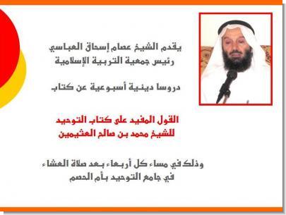 دروسا أسبوعية دينية للشيخ عصام إسحاق العباسي رئيس جمعية التربية الإسلامية بجامع التوحيد بأم الحصم