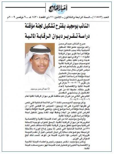 النائب بومجيد يقترح تشكيل لجنة مؤقتة لدراسة تقرير ديوان الرقابة المالية
