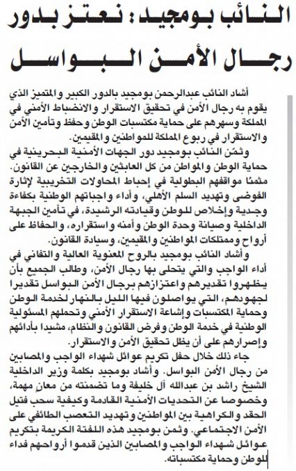 أشاد النائب عبدالرحمن بومجيد بالدور الكبير والمتميز الذي يقوم به رجال الأمن في تحقيق الاستقرار والانضباط الأمني في المملكة وسهرهم على حماية مكتسبات الوطن وحفظ وتأمين الأمن والاستقرار في ربوع المملكة للمواطنين والمقيمين.وثمّن النائب بومجيد دور الجهات الأمنية البحرينية في حماية الوطن والمواطن من كل العابثين والخارجين عن القانون. مثمنًا مواقفهم البطولية في إحباط المحاولات التخريبية لإثارة الفوضى وتهديد السلم الأهلي¡ وأداء واجباتهم الوطنية بكفاءة وجدية وإخلاص للوطن وقيادته الرشيدة¡ في تأمين الجبهة الداخلية وصيانة وحدة الوطن وأمنه واستقراره¡ والحفاظ على أرواح وممتلكات المواطنين والمقيمين¡ وسيادة القانون.وأشاد النائب بومجيد بالروح المعنوية العالية والتفاني في أداء الواجب والتي يتحلى بها رجال الأمن¡ وطالب الجميع بأن يظهروا تقديرهم واعتزازهم برجال الأمن البواسل تقديرا لجهودهم¡ التي يواصلون فيها الليل بالنهار لخدمة الوطن وحماية المكتسبات وإشاعة الاستقرار الأمني وتحملهم المسئولية الوطنية في خدمة الوطن وفرض القانون والنظام¡ مشيدا بأدائهم وإصرارهم على أن يظل تحقيق الأمن والاستقرار.جاء ذلك خلال حفل تكريم عوائل شهداء الواجب والمصابين من رجال الأمن البواسل. وأشاد بومجيد بكلمة وزير الداخلية الشيخ راشد بن عبدالله آل خليفة وما تضمنته من معانٍ مهمة¡ وخصوصا عن التحديات الأمنية القادمة وكيفية سحب فتيل الحقد والكراهية بين المواطنين وتهديد التعصب الطائفي على الأمن الاجتماعي. وثمن بومجيد هذه اللفتة الكريمة بتكريم عوائل شهداء الواجب والمصابين الذين قدموا أرواحهم فداء للوطن وحماية مكتسباته.