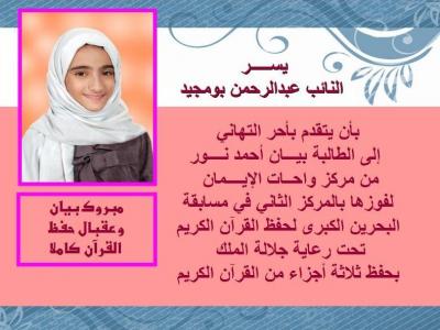 نتقدم بأحر التهاني إلى الطالبة بيـــان أحمد نــــور من مركز واحــات الإيــــمان لفوزها بالمركز الثاني في مسابقة البحرين الكبرى لحفظ القرآن الكريم