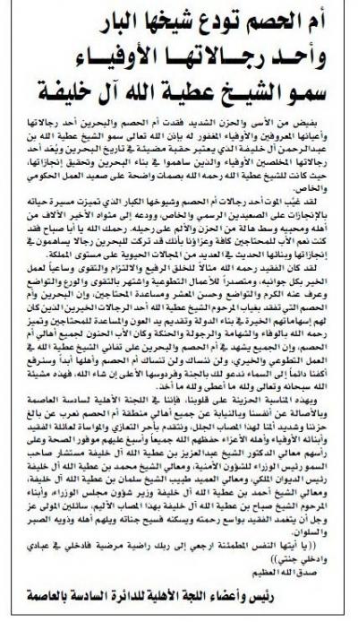 اللجنة الأهلية للدائرة السادسة بالعاصمة تنعي فقيد أم الحصم والبحرين المغفور له بإذن الله سمو الشيخ عطية الله آل خليفة