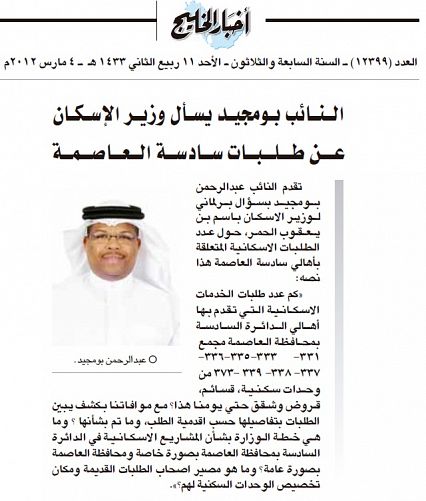 تقدم النائب عبدالرحمن بومجيد بسؤال برلماني لوزير الاسكان باسم بن يعقوب الحمر¡ حول عدد الطلبات الاسكانية المتعلقة بأهالي سادسة العاصمة هذا نصه:«كم عدد طلبات الخدمات الاسكانية التي تقدم بها أهالي الدائرة السادسة بمحافظة العاصمة مجمع 331- 333-335-336-337- 338- 339 -373 من وحدات سكنية¡ قسائم¡ قروض وشقق حتي يومنا هذا¿ مع موافاتنا بكشف يبين الطلبات بتفاصيلها حسب اقدمية الطلب¡ وما تم بشأنها ¿ وما هي خطة الوزارة بشأن المشاريع الاسكانية في الدائرة السادسة بمحافظة العاصمة بصورة خاصة ومحافظة العاصمة بصورة عامة¿ وما هو مصير اصحاب الطلبات القديمة ومكان تخصيص الوحدات السكنية لهم¿».