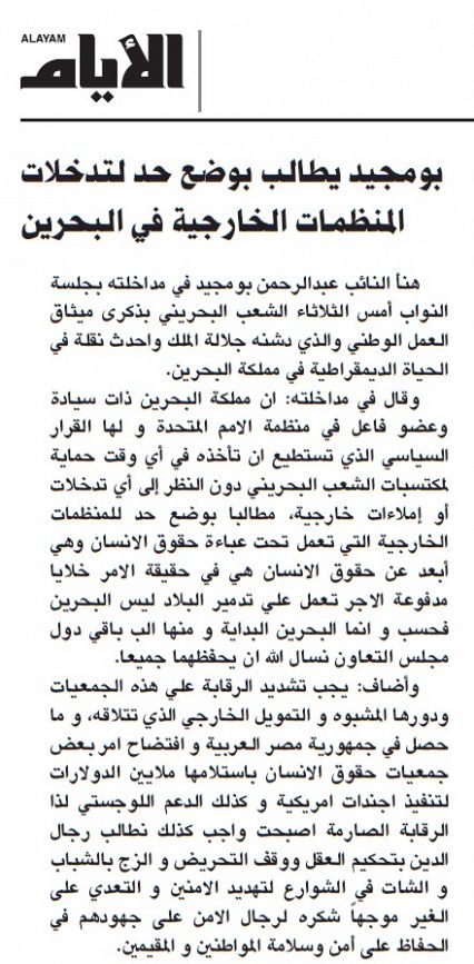 بومجيد يطالب بوضع حد لتدخلات المنظمات الخارجية في البحرين