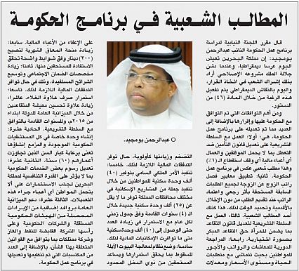 ومن أهم التوافقات التي تم التوافق مع الحكومة عليها وإقرارها بالإضافة إلى العديد مما تم تعديله على برنامج عمل الحكومة، هي: أولا: العمل مع السلطة التشريعية على تعديل قانون التأمين ضد التعطل بما لا يحمل الموظفين والعمال أي أعباء مالية أي وقف استقطاع الـ (1%) وهذا مطلب شعبي عكس في برنامج عمل الحكومة. ثانيا: تطبيق معايير فصل راتب الزوج عن الزوجة لجميع الطلبات السابقة المستحقة بأثر رجعي واعتماد الراتب عند تقديم الطلب من دون الإخلال بالأقدمية وتحديد الوقت لذلك، هذا كذلك أحد المطالب الشعبية. ثالثا: العمل مع السلطة التشريعية لتعديل قانون التقاعد بما يضمن للمرأة حق التقاعد المبكر بصورة اختيارية. رابعا: المراجعة الدورية للمعاشات والرواتب والأجور للمواطنين بحيث تتماشى مع متطلبات الحياة ومستوى الأسعار ومعدلات التضخم وزيادتها كأولوية، حال توفر التدفقات المالية اللازمة لذلك. خامسا: تنفيذ الأمر الملكي السامي بتوفير (40) ألف وحدة سكنية للمواطنين من خلال تنفيذ جملة من المشاريع الإسكانية في مختلف محافظات المملكة توفر ما لا يقل عن (25) ألف وحدة سكنية جديدة خلال الـ (4) سنوات القادمة وفق جدول زمني لكل عام مع الاستمرار في زيادة العدد حتى الوصول إلى (40) ألف وحدة سكنية متى ما توافرت الإمكانيات المادية لذلك. سادسا: وضع نظام لمعالجة البيوت الآيلة للسقوط بما يحقق استمرارها ويساعد المستحقين من ذوي الدخل المحدود على الإعفاء من الأعباء المالية. سابعا: زيادة منحة المعاق الشهرية لتصبح (200) دينار وفق ضوابط واضحة تحقق الاستفادة للمستحقين منها. ثامنا: زيادة مخصصات الضمان الاجتماعي وتوسيع الشرائح المستفيدة، وذلك في حال توافر التدفقات المالية اللازمة لذلك. تاسعا: استمرار صرف علاوة الغلاء. عاشرا: زيادة علاوة تحسين معيشة المتقاعدين من خلال الميزانية العامة للدولة ابتداء من 2015م، وللسنوات القادمة بالتوافق مع السلطة التشريعية. الحادية عشرة: إنشاء وحدة خاصة في كل المستشفيات الحكومية الموجودة والمزمع إنشاؤها تعنى برعاية كبار السن الذين تجاوزت أعمارهم (60) سنة. الثانية عشرة: تعديل رسوم بعض الخدمات الحكومية بما لا يؤثر على القدرة التنافسية لمملكة البحرين لجذب الاستثمارات على ألا يتحمل المواطن أي أعباء جراء هذه التعديلات. الثالثة عشرة: دعم الميزانية العامة بروافد إضافية من الإيرادات المحصلة من الهيئات الحكومية المستقلة والشركات الحكومية وعلى رأسها الشركة القابضة للنفط والغاز وشركة ممتلكات بما يتوافق مع القوانين المتعلقة بهذا الشأن، بالإضافة إلى العدد من المكتسبات التي تم تنظيمها وتعديلها في برنامج عمل الحكومة.