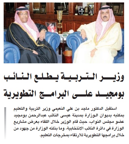 استقبل الدكتور ماجد بن علي النعيمي وزير التربية والتعليم بمكتبه بديوان الوزارة بمدينة عيسى النائب عبدالرحمن بومجيد عضو مجلس النواب، حيث قام الوزير خلال اللقاء بعرض مشاريع الوزارة في دائرة النائب الانتخابية، وما بذلته الوزارة من جهود من خلال برامجها التطويرية للارتقاء بمخرجات التعليم