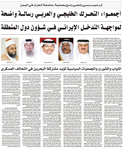 وأعلن أحمد بن إبراهيم الملا رئيس مجلس النواب التأييد النيابي لقرار دول مجلس التعاون الخليجي في الاستجابة لطلب الرئيس اليمني بحماية الشعب اليمني من مليشيات الحوثي، مؤكدا أن عملية «عاصفة الحزم» هي الرد الحاسم على الحوثيين الذين انقلبوا على الشرعية في جمهورية اليمن الشقيقة، وهي رسالة واضحة للاحتلال الإيراني وخطط التوسع، التي باتت تتضح في التدخل الإيراني في شؤون دول الخليج العربي والدول العربية.