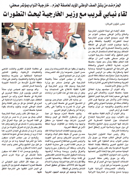 وذكر النواب أن الأيام المقبلة ستشهد لقاء بين «النواب» وبين وزير الخارجية لايضاح المستجدات حول العملية العسكرية التي شاركت فيها البحرين ودول الخليج باﻹضافا الى دول عربية وإسلامية أخرى ﻹحقاق الحق واستعادة الشرعية.