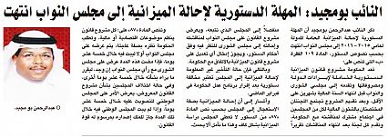 ذكر النائب عبدالرحمن بومجيد أن المهلة الدستورية لإحالة الميزانية العامة للدولة لعامي 2015 - 2016 إلى مجلس النواب انتهت بحسب نصوص الدستور، المادة 109 الفقرة «ب» التي تنص على: